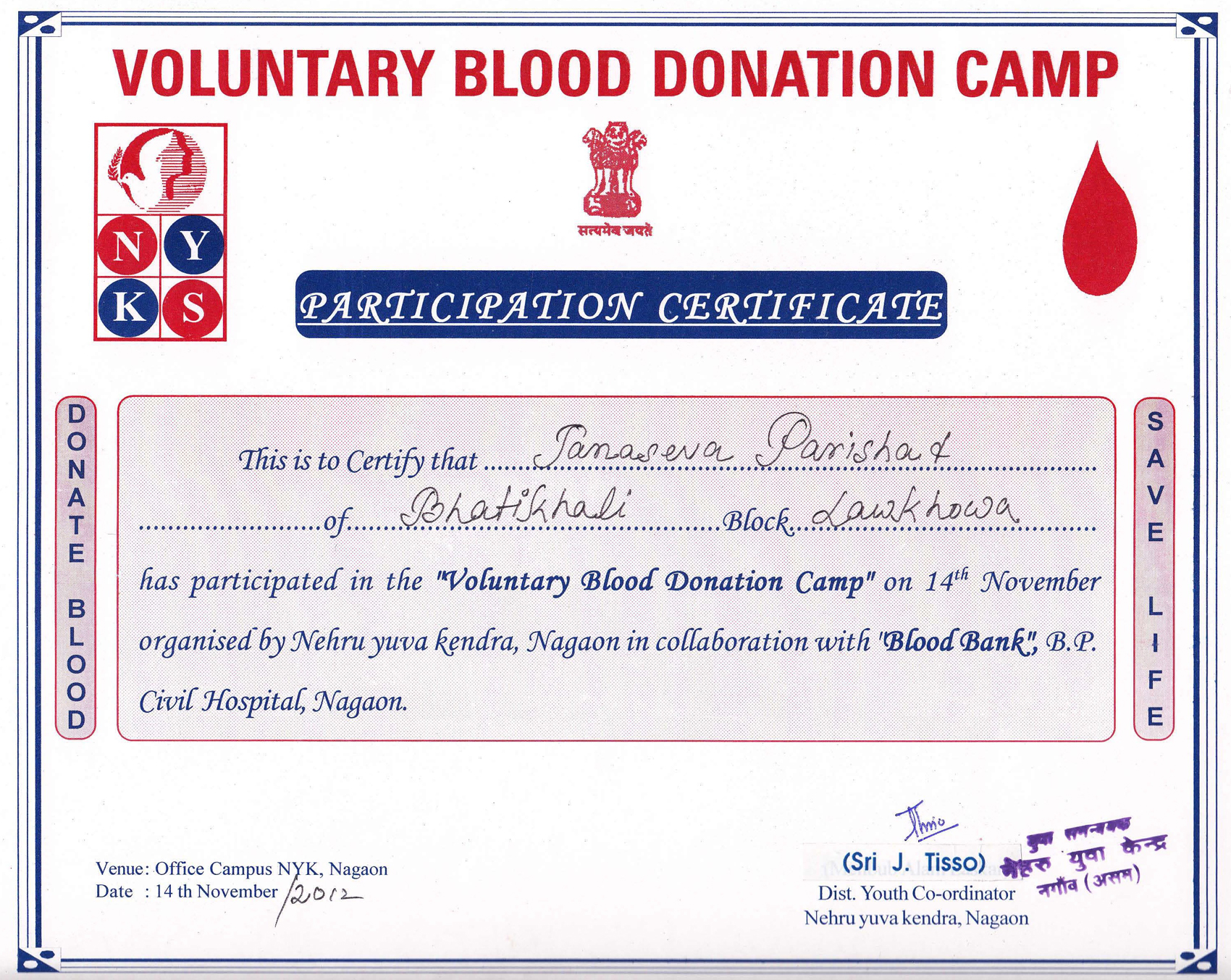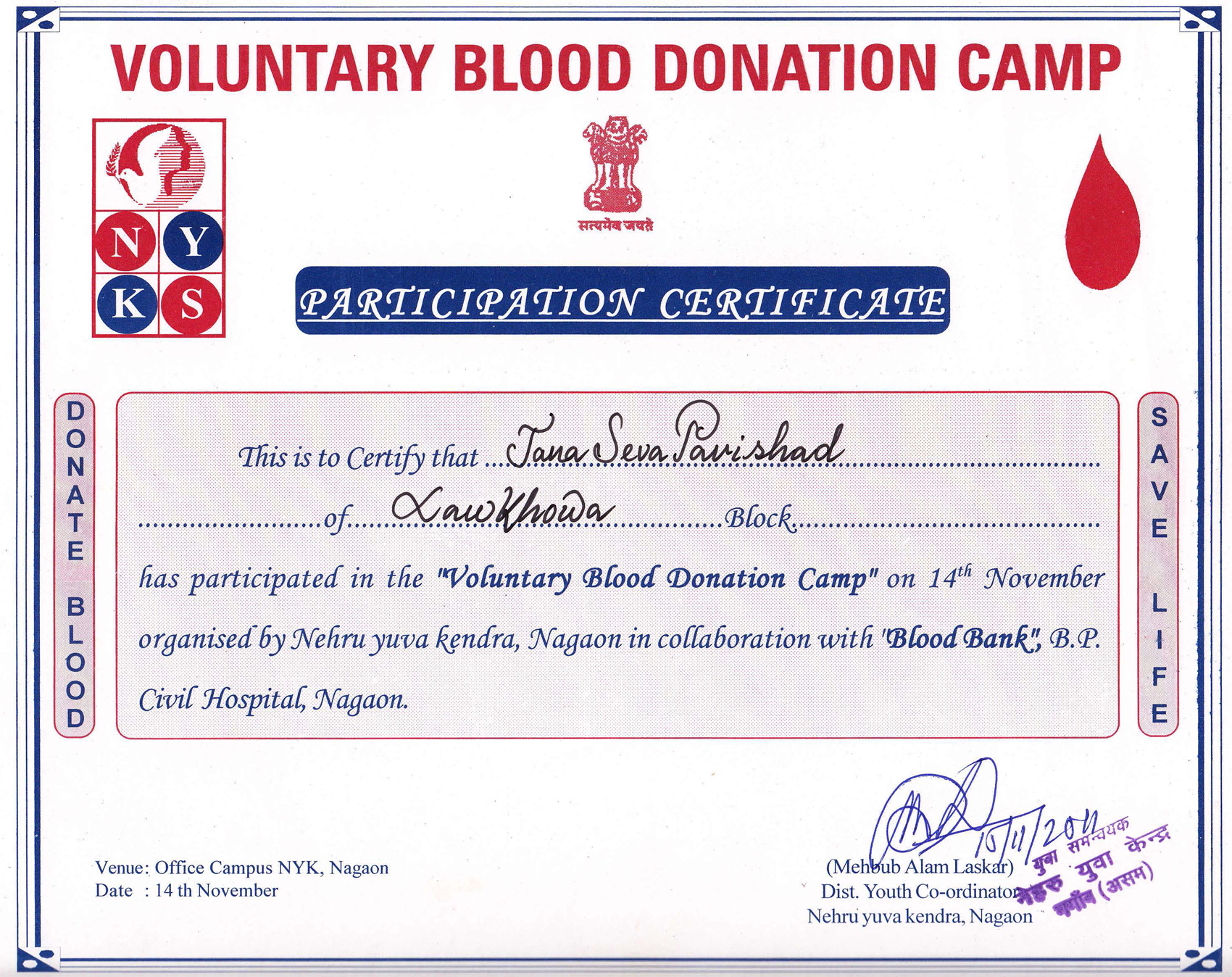 Voluntary Blood Donation Certificate